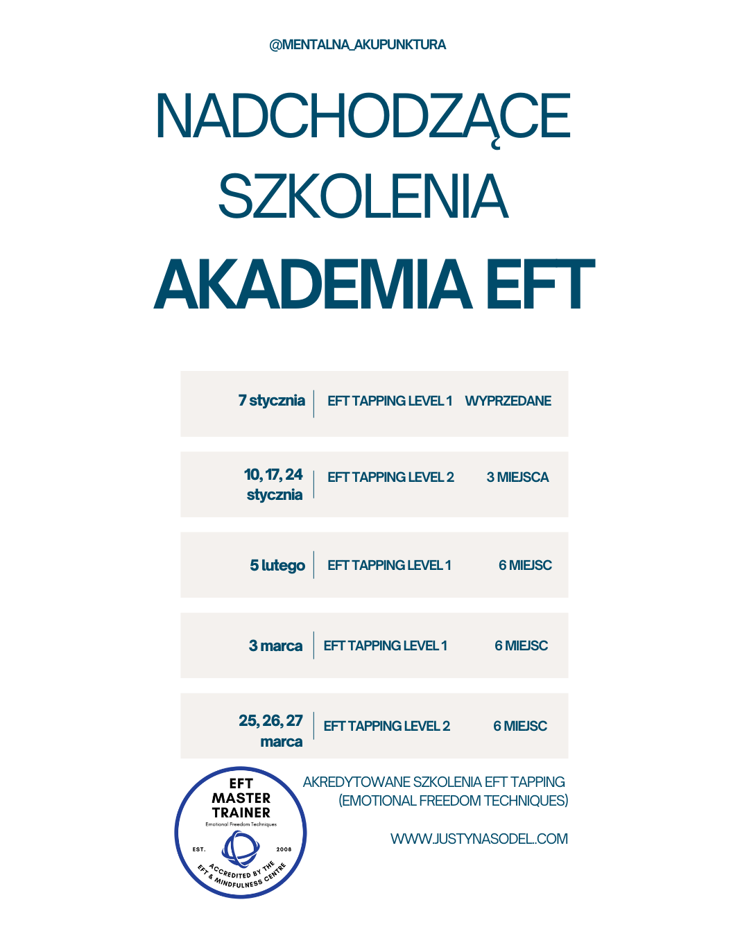 Jeśli chcesz dowiedzieć się więcej o szkoleniach EFT napisz do mnie info@justynasodel.com