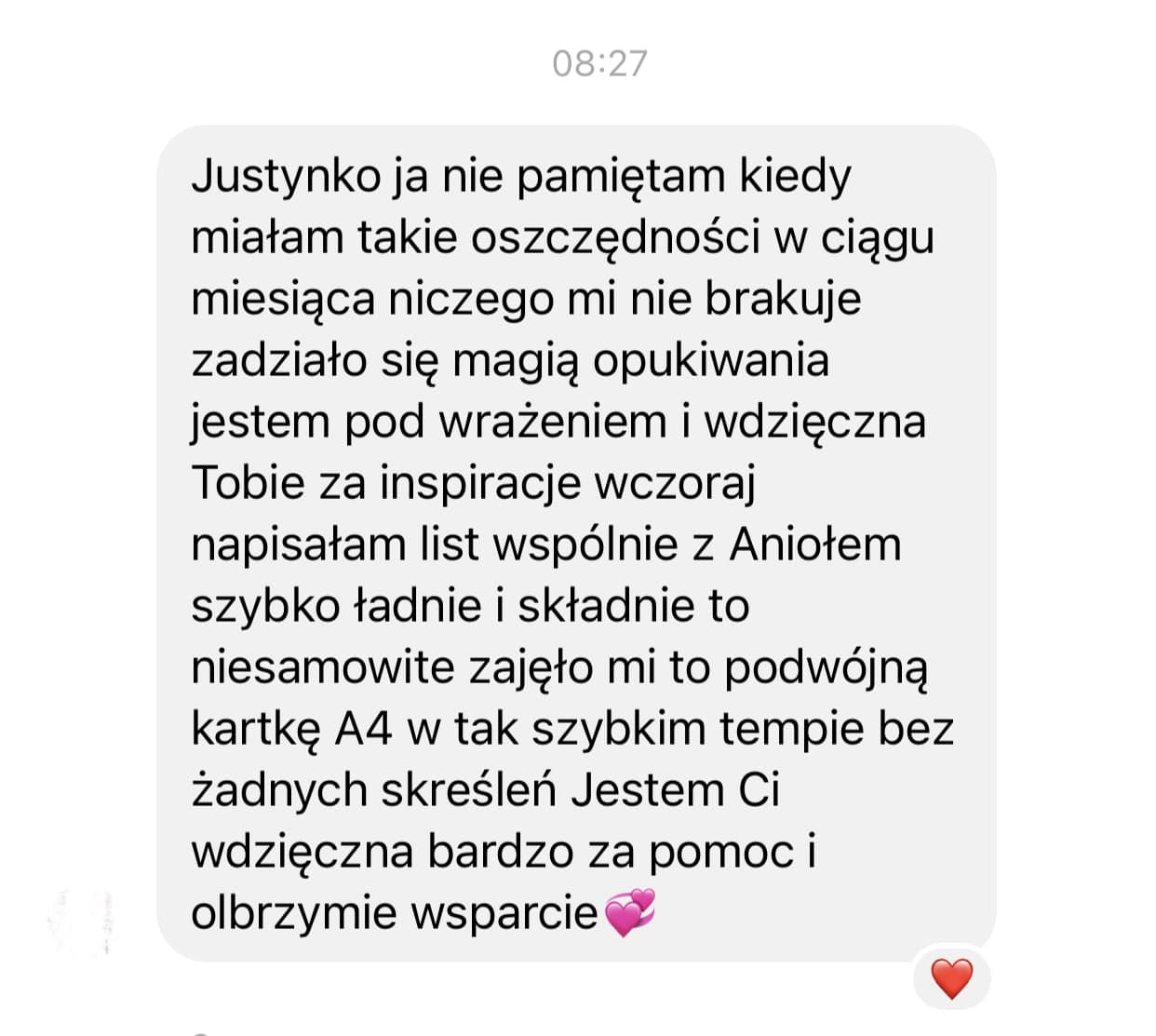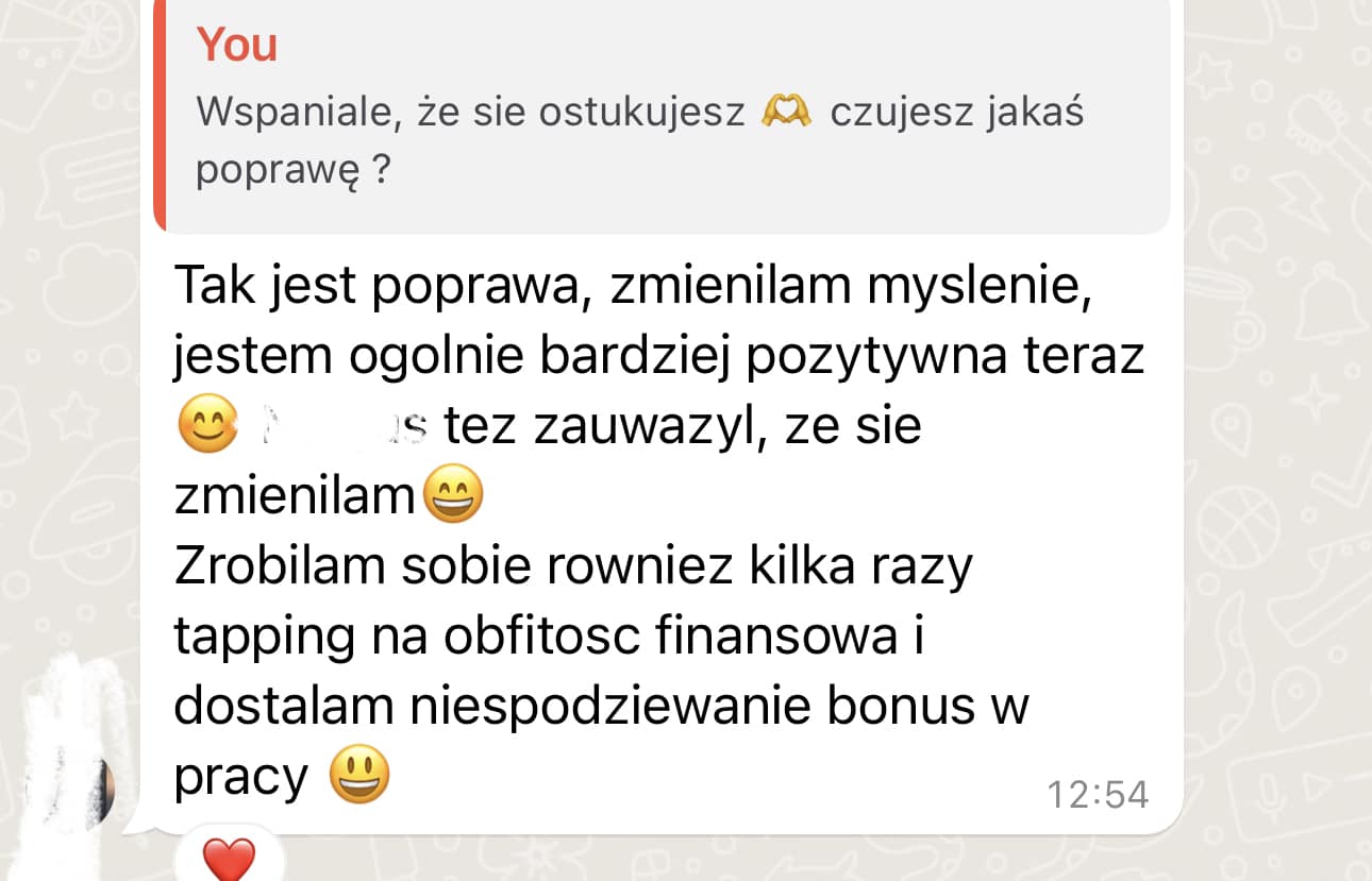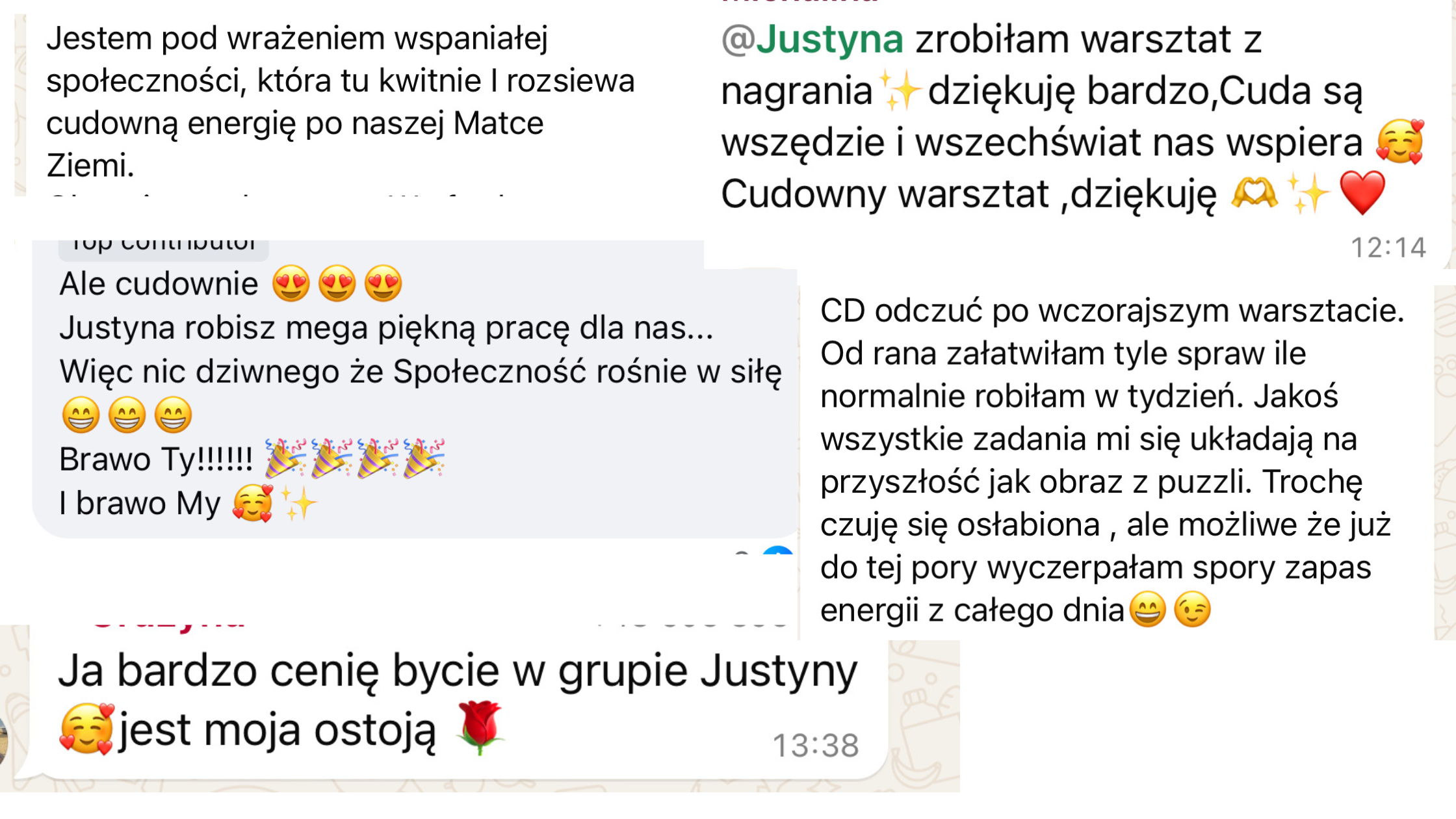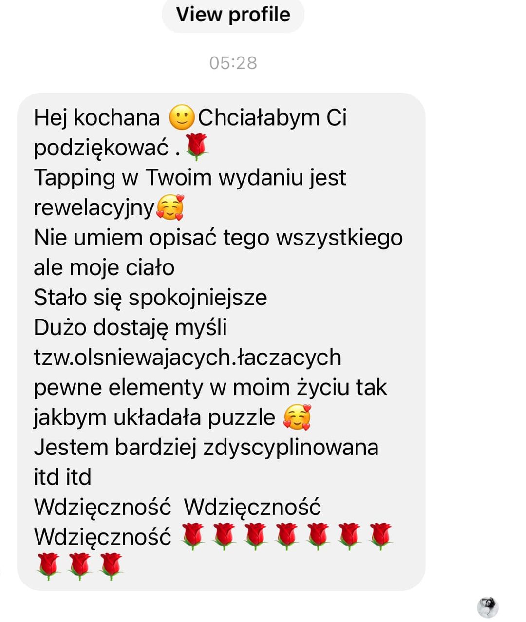 Wdzięczna za tą społeczność, wsparcie Justyny na naszym czacie nieocenione. Czuję że w ciągu 2 miesięcy przepracowałam bardzo dużo. Oczywiście plus sesję na jakieś głębsze od dawna skrywane tematy potrafią nadać dobry kierunek. Oczywiście od Justyny dowiedziałam na warsztatach jak stosuwac tapping według siebie i czucia i tak na codzień stosuje co przynosi dużą ulgę." Ania, Facebook