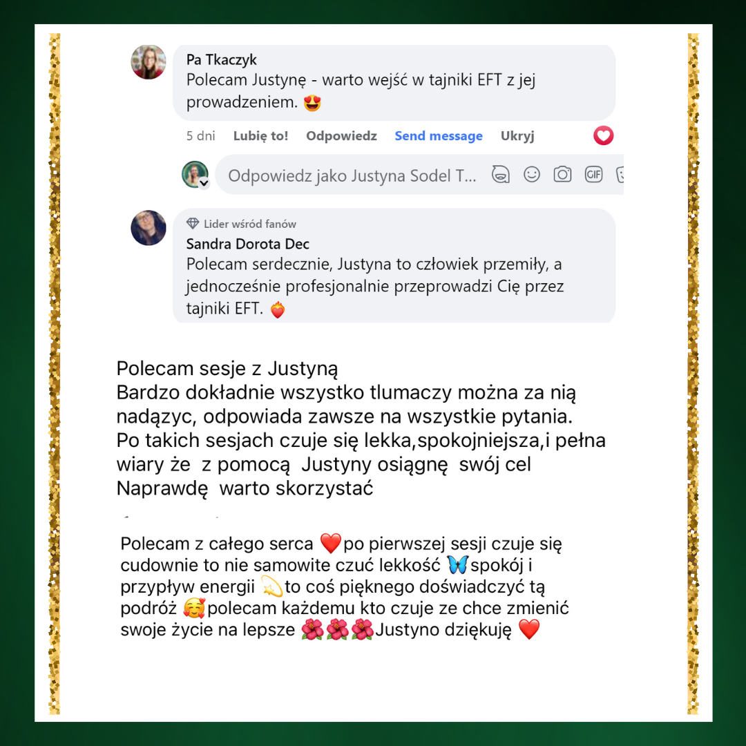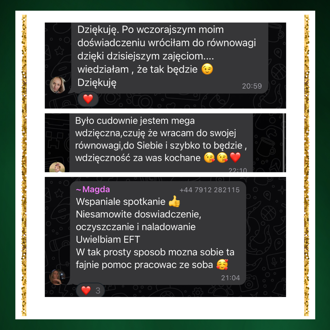 Ja sama przeszłam terapię EFT jako klientka i po tej terapii, widząc niesamowite zmiany w moim życiu postanowiłam zostać terapeutką.